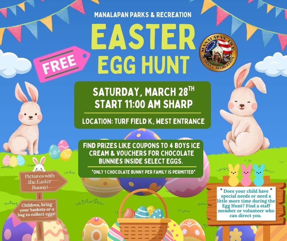 HOME GOVERNMENT Agendas Business Code Book of Township Ordinances Form of Gov/Org. History Maps Mayor & Township Committee Affordable Housing Information Public Notices Storm Water Management DEPARTMENTS Administration Community Alliance Construction Finance Department Health Department Mgt Information Services Municipal Clerk Municipal Court Public Works Parks & Recreation Purchasing Planning & Zoning Senior Center Shade Tree Tax Collector Tax Assessor Zoning/Enforcement Police Department COMMITTEES Board of Health Cable Television Advisory Committee Diversity Committee Economic Development Council (EDC) Emer. Mgmt. Coun. & Annex Sub-Com. Environmental Commission Historical Committee Manalapan Arts Council (MAC) Manalapan MRC-CERT Mayor’s Council on Special Needs Mun. Ag. Advisory Comm. Recreation Advisory Board Shade Tree Committee Teen Leadership Committee Safety Advisory Committee Utilities Committee Veterans Affairs Advisory Committee NEWS & EVENTS Job Openings Monthly Calendar RESIDENTS Assistance Programs Applications Dog Park Adopt A Spot/Road Program Recycling & Garbage No Knock List Manalapan Township Television Community Center Coronavirus Information Water Sale Information CONTACT US Contact Information Directions Emergency Numbers SHOP Parks & Recreation Alerts Coaches / Volunteers Organized Sports Outside Organizations Parks & Recreation Active Park Properties Program/Registration Information Special Events Summer Camp Therapeutic Recreation Thompson Grove Park Disc Golf Course Events Alerts Spring Park Hours: Spring park hours will go into effect Monday, March 9th.